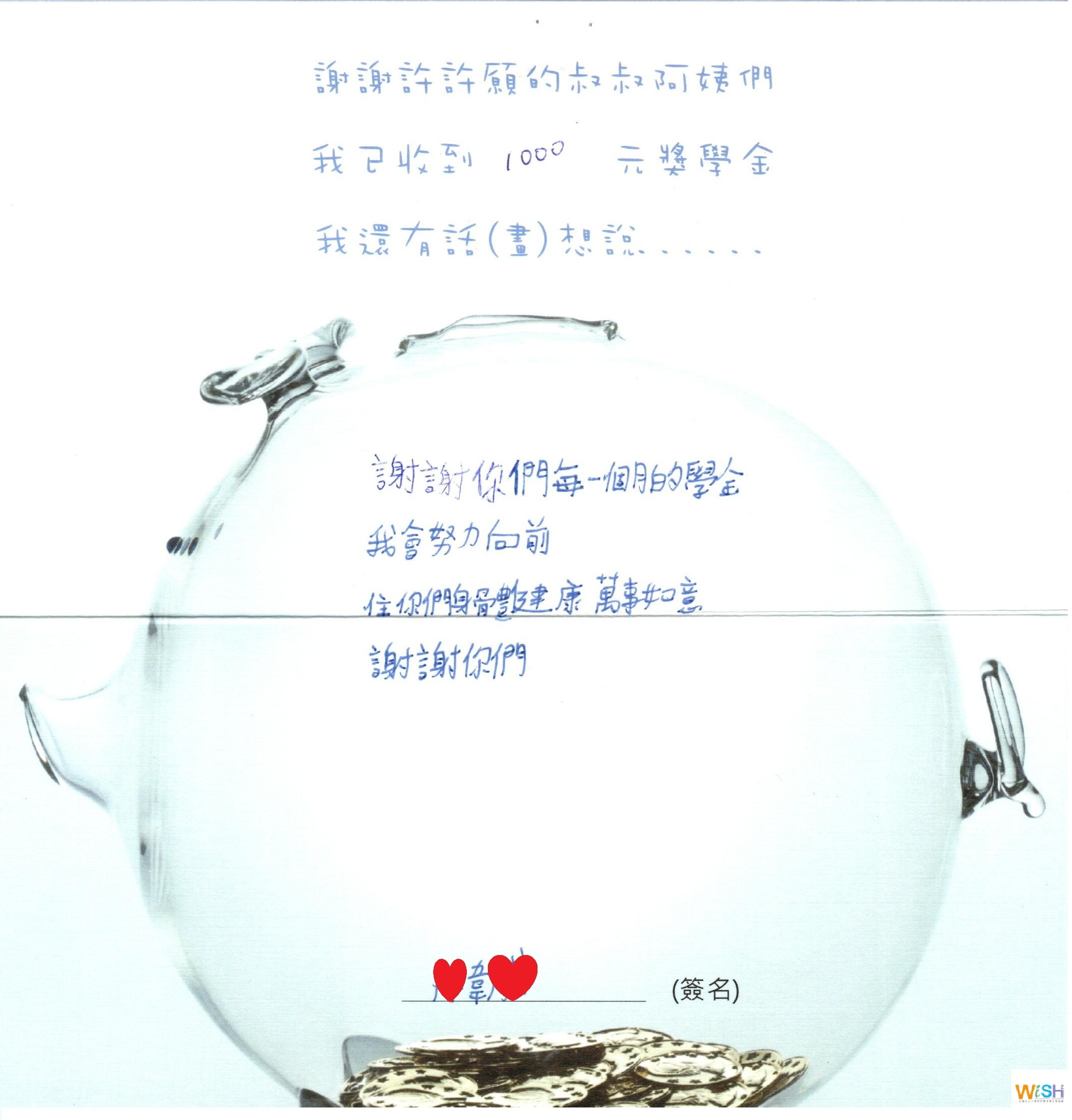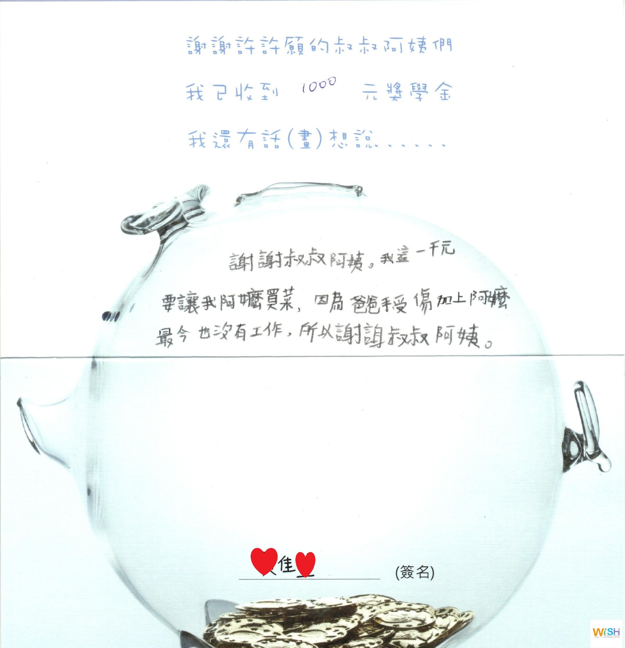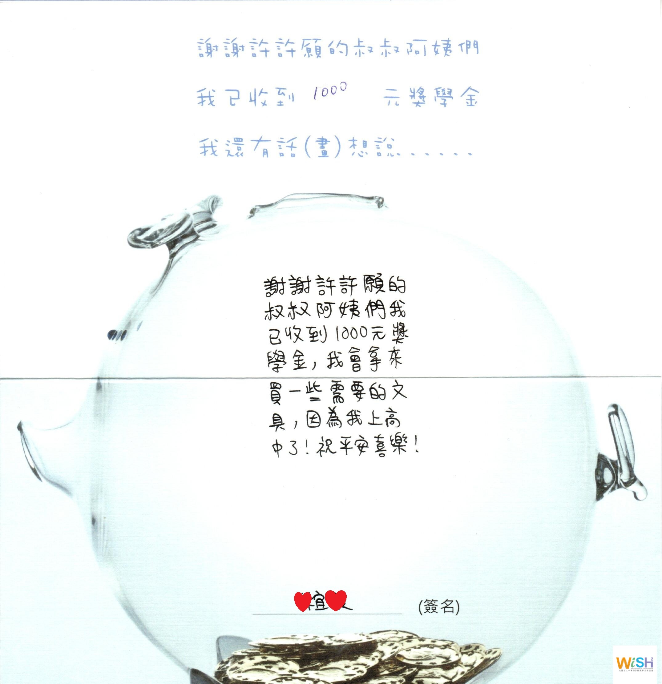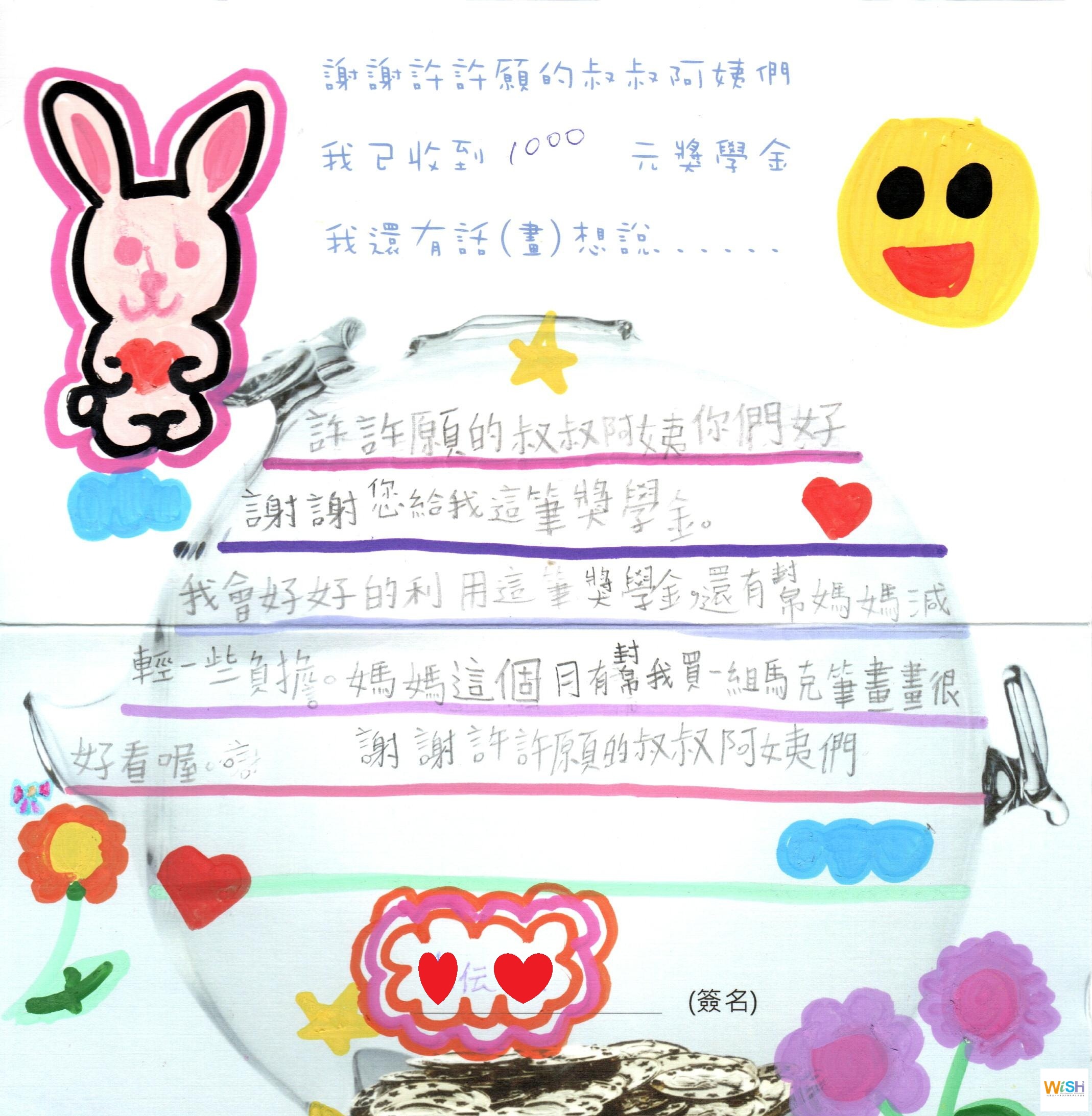 許許願持續*捐助{偏鄉清寒獎助學金}每月1000元,