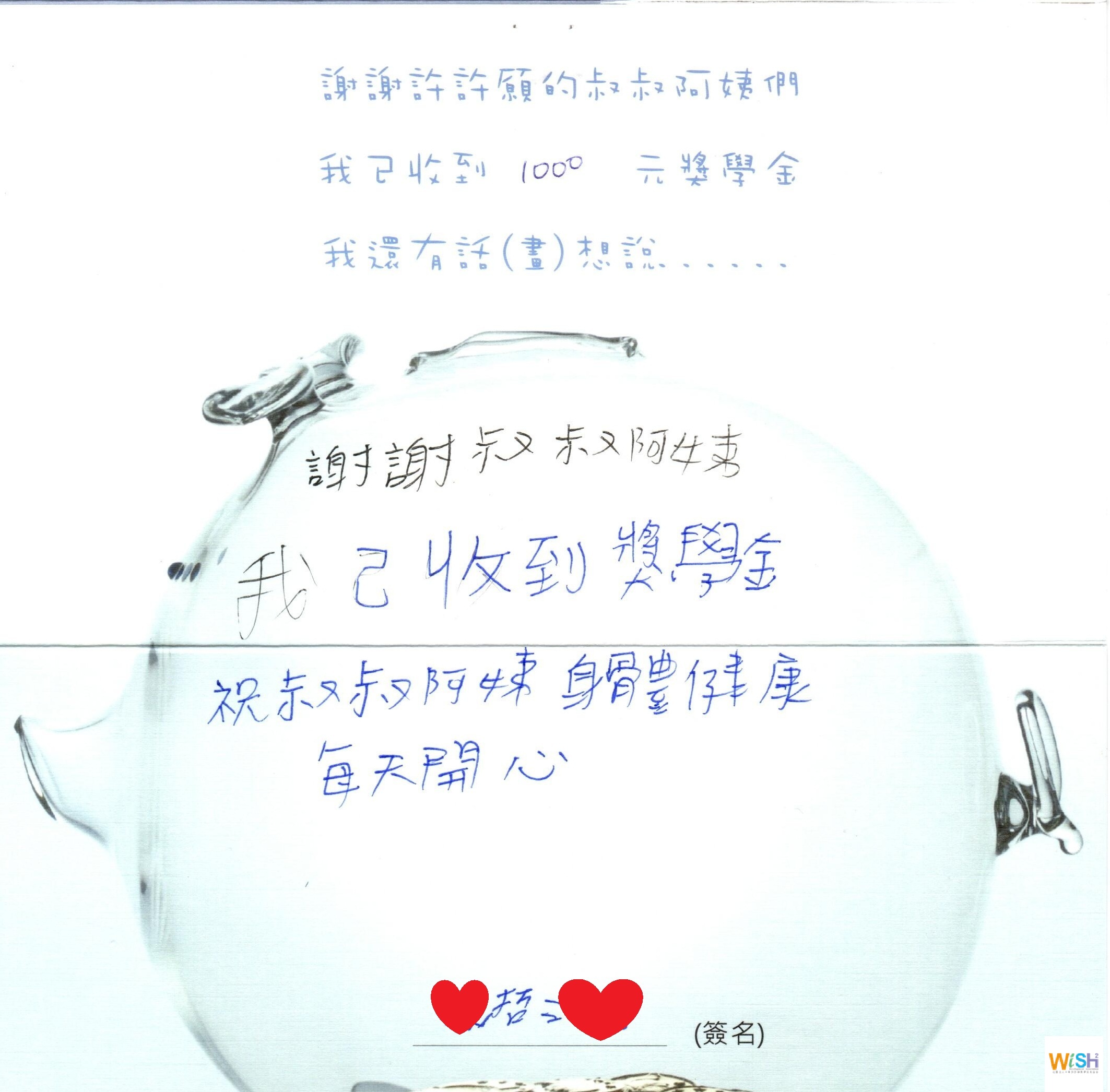 許許願的叔叔阿姨們資助…. 我們也會分享學童收到獎助學金的喜悅,及對未來的期許….