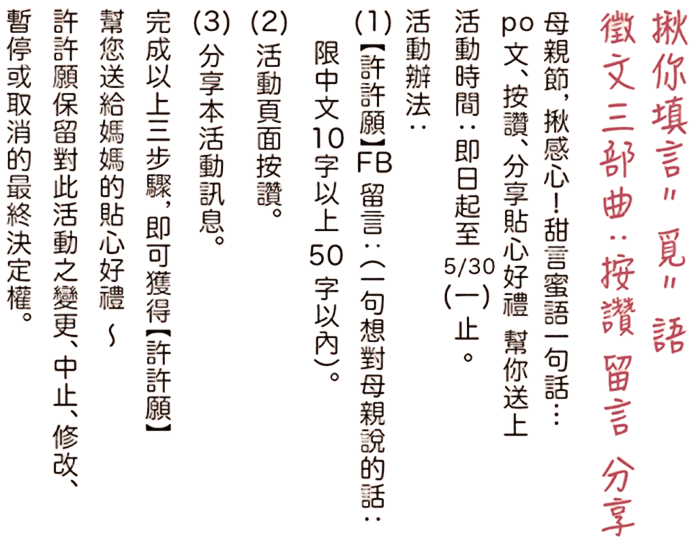 因為全台進入防疫第三級,【五月天 揪你填言"覓"語】徵文三部曲活動,參加者的精美好禮,將於5月28號後會統計陸續寄出,謝謝您的耐心等待,如有不便之處請見諒!